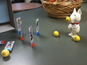 This little gift seen below came last week, and we’ve been playing with it ever since.This is Auggie. You put one of the yellow balls in his mouth (tight and snug), and squeeze him until the ball pops (more like shoots) out. The goal is to knock over those alien sticks. A word to the wise: If you aim Auggie straight up, you are most likely to get hit with the yellow ball in an instant. I would know.