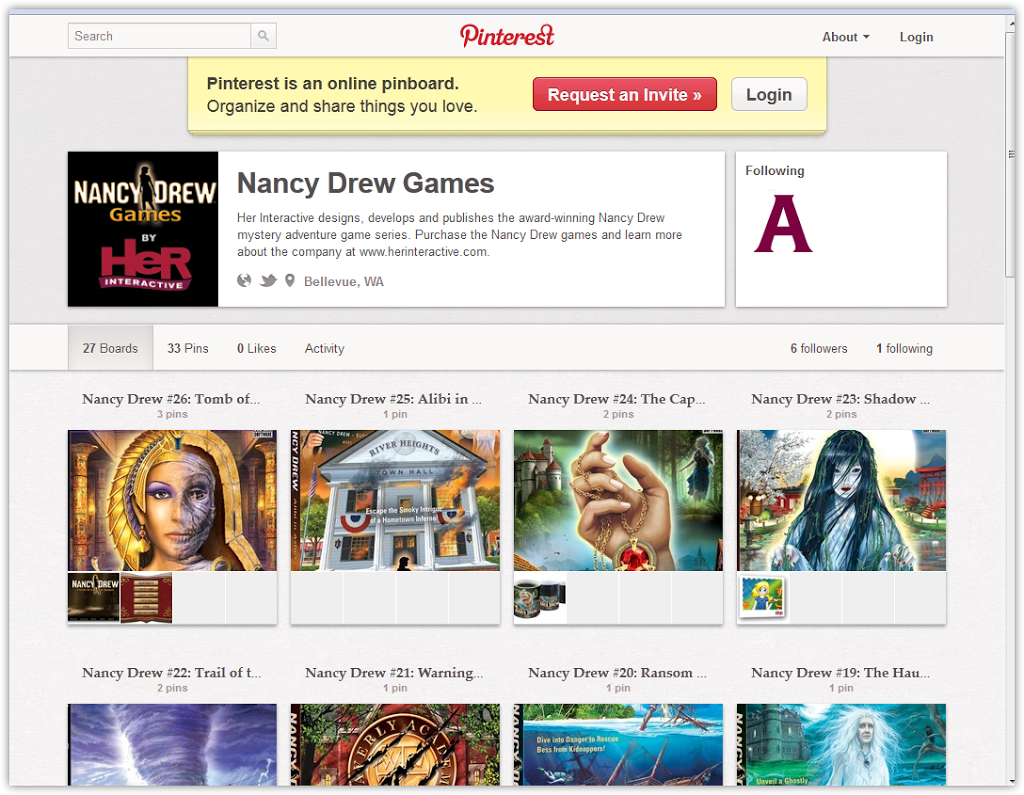 Hooray Friday! We also have some fun news: we now have a Pinterest Account. Check it out and follow us, and re-pin your favorite Nancy Drew Games! We love pictures, and especially love sharing them. You can also visit any of our product pages and from there, you can pin the game image to your board.
