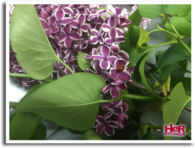 Today a fellow team member brought in her lilacs, and shared them with everyone. Now the entire office smells like lilacs (very cool!), and I also understand what Nancy experienced in the book The Mystery at Lilac Inn. See the stowaway below? (Ladybug!)